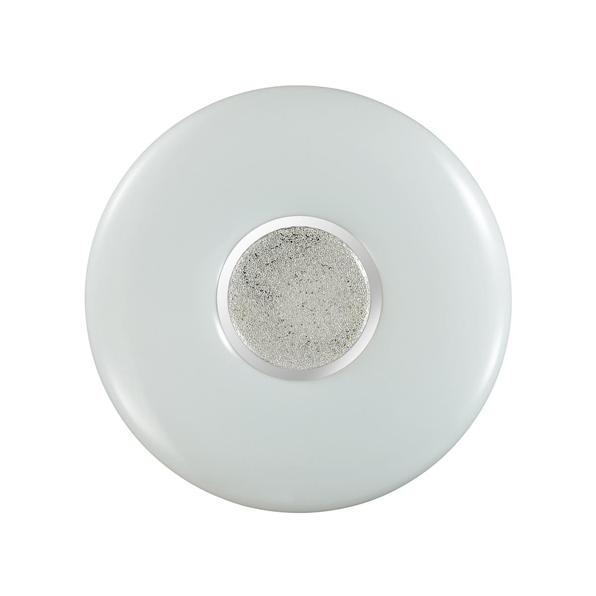 Светильник 2074/EL серии LAZANA cостоит из металлического основания (базы) и пластикового рассевателя. Материал рассеивателя - высококачественный акрил белого матового цвета, обеспечивающий светильнику равномерное рассеивание и хорошее светопропускание. Форма плафона: круглая, декорирована центральным кантом цвета хром и вставкой с пластиковой крошкой, которая придает включенному светильнику красивый эффект переливания. Степень защиты IP43 позволяет использовать светильник в определенных зонах влажных помещений. В комплект входит заменяемый LED модуль с линзами, мощностью 72Вт, которая соответствует лампе накаливания 520Вт. А также пульт ДУ, с помощью которого осуществляется плавное изменение цветовой температуры 3000-6000К, изменение яркости, переход в режим переключения теплого/белого/холодного/ночного света.